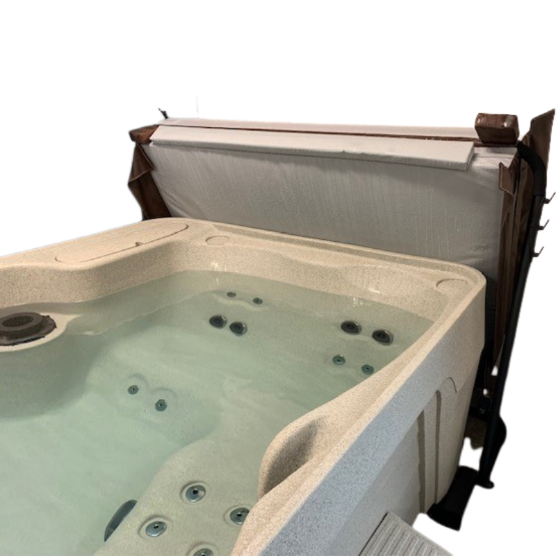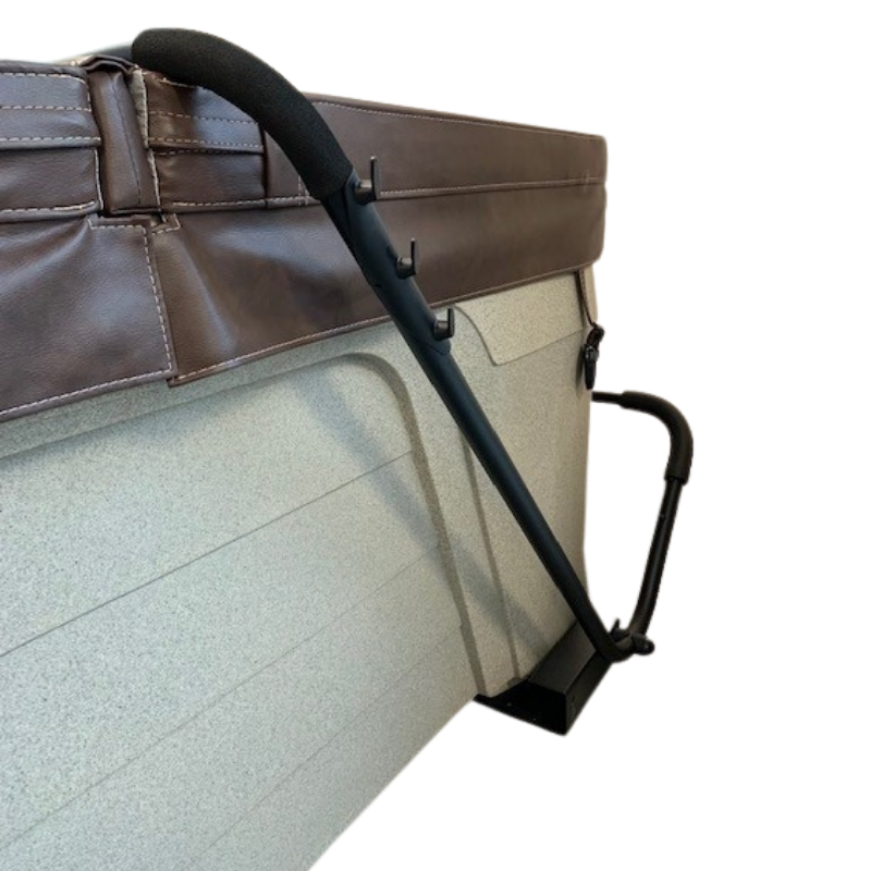 The CoverMate II – Undermount allows the open cover to rest in a lower position for a slightly less-obstructed view. The mounting brackets are simply slid underneath the hot tub and uses the weight of the filled tub to keep it in place.