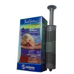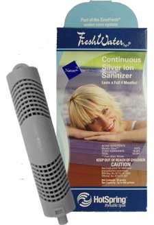 Silver is an effective bactericide. A Freshwater Mineral Spa Sanitizer cartridge in your filter compartment releases a steady supply of silver ions into the hot tub water to inhibit the growth of bacteria. It is a fast, simple and effective way to sanitize your hot tub!